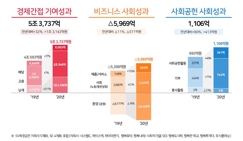 경제간접기여 5조3737억원, 비즈니스 사회성과 -5969억원, 사회공헌 사회성과 1106억원