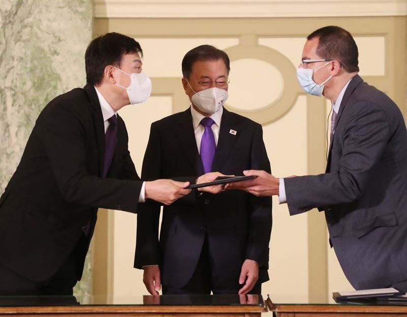 문 대통령은 인사말에서 "미국의 원천기술과 한국의 생산능력이 결합해 세계적인 백신 공급을 획기적으로 늘리고 코로나 조기 종식에 기여하는 것이 목적"이라고 했다.