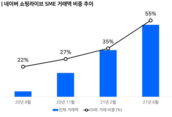 그 결과 쇼핑라이브를 자유자재로 활용하는 SME가 늘면서 1년 전에 비해 SME 판매자 는855%, 거래액은 3250% 늘었다. 특히 SME 거래액 비중이 6월 기준 전체의 55% 수준까지 올라와 가파른 성장세를 유지하고 있다.