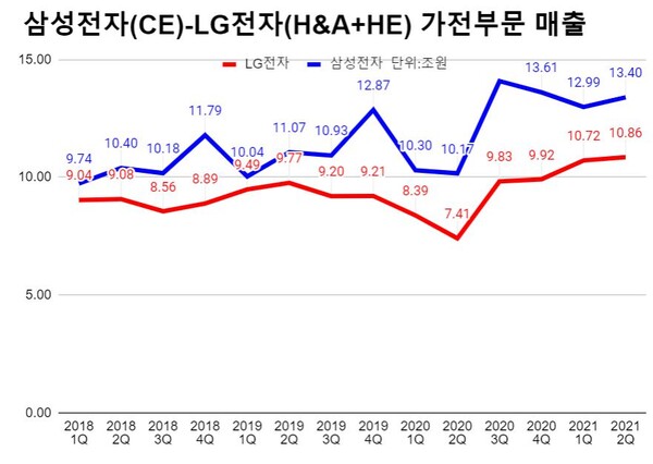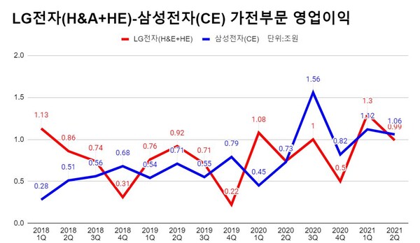 1분기 가전부문 영업이익은 삼성이 1조1200억원, LG가 1조3015억원으로 LG가 앞섰지만 2분기에는 역전됐다.