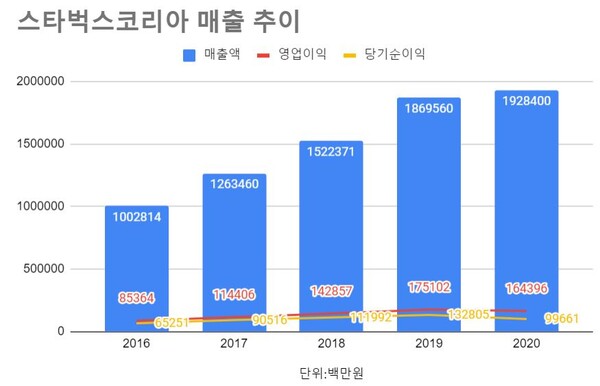코로나19로 타격을 입었다지만 스타벅스코리아의 매출은 점포 수 증가에 따라 2018년 1조5200억원, 2019년 1조8700억원, 2020년 1조9300억원 등 늘고 있다.