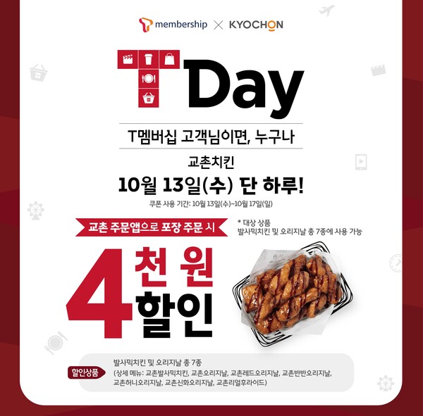 교촌치킨이 SKT T멤버십 고객을 대상으로 교촌치킨 4천원 할인 쿠폰을 제공하는 '티데이' 프로모션을 13일 실시한다고 밝혔다. 할인 쿠폰은 17일까지 사용 가능하고 T멤버십 앱에서 이 날 단 하루만 발급받을 수 있다.