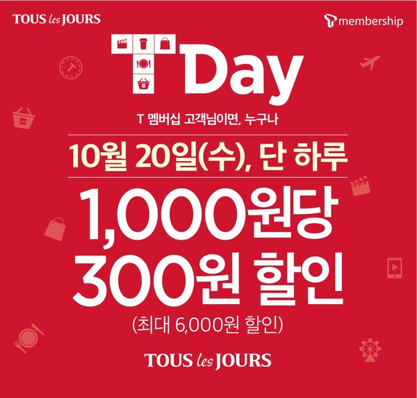 T멤버십 고객이라면 누구나 20일 오전 9시부터 밤 11시 59분까지 뚜레쥬르 매장에서 제품 구매 시 1000원당 300원 할인 혜택을 받을 수 있다.