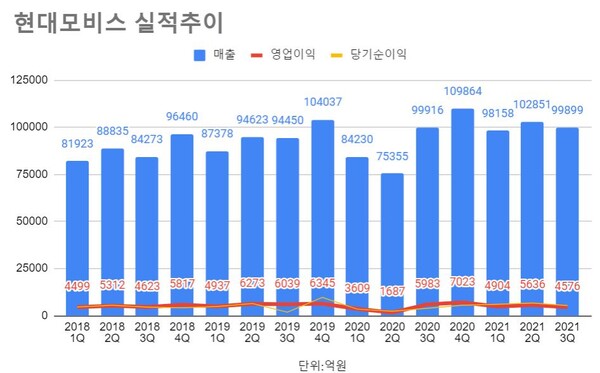 현대모비스는 장기화된 글로벌 반도체 수급 영향으로 완성차 물량이 감소하고 지속적인 물류비 상승으로 영업이익이 감소했다고 설명했다.