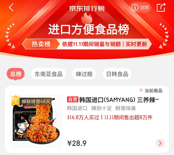 불닭볶음면 제품들은 티몰에서 수입 라면 베스트셀러 랭킹 1위와 3위를 기록했고 징동닷컴에서도 수입 인스턴트 식품 랭킹 1위, 3위, 4위, 7위에 올랐다.