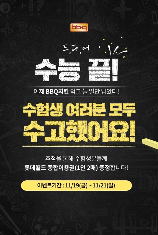 BBQ 관계자는 “시험 준비로 고생한 수험생들을 위해 특별한 이벤트를 준비했다”며 “BBQ 치킨과 함께 그동안 쌓였던 스트레스를 푸는 기회가 되기를 바란다”고 말했다.