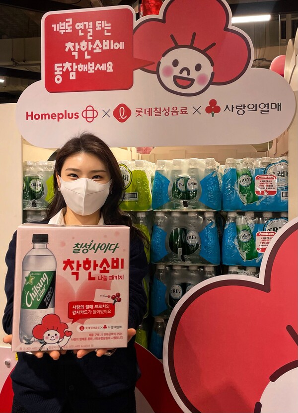 롯데칠성음료가 ‘홈플러스', '사랑의열매 사회복지공동모금회(이하 사랑의열매)'와 손잡고 전국 홈플러스 점포와 온라인 채널에서 '착한 소비 캠페인'을 20일부터 내년 1월말까지 진행한다고 밝혔다.