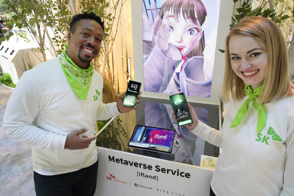 ▶ 5일 미국 라스베이거스 컨벤션센터에 설치된 SK텔레콤 공동 전시 부스에서 모델들이 메타버스 플랫폼 '이프랜드(ifland)'를 체험하고 있다.