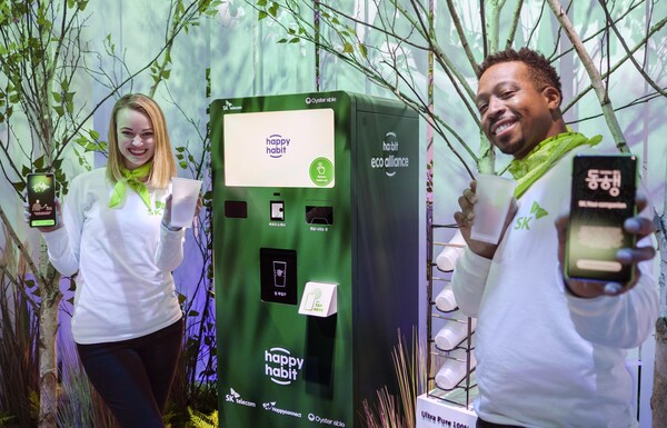 ▶ 5일 미국 라스베이거스 컨벤션센터에 설치된 SK텔레콤 공동 전시 부스에서 모델들이 다회용 컵 '해피 해빗'을 안내하고 있다.