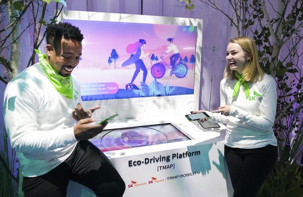 ▶ 5일 미국 라스베이거스 컨벤션센터에 설치된 SK텔레콤 공동 전시 부스에서 모델들이 최적 경로 내비게이션 '티맵'을 체험하고 있다.