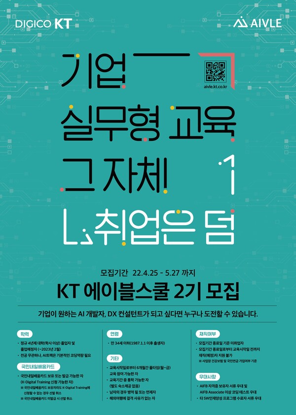 [포쓰저널] KT는 25일부터 청년 AI 인재양성 프로그램 KT 에이블스쿨(KT AIVLE School) 2기 교육생을 모집한다고 밝혔다.