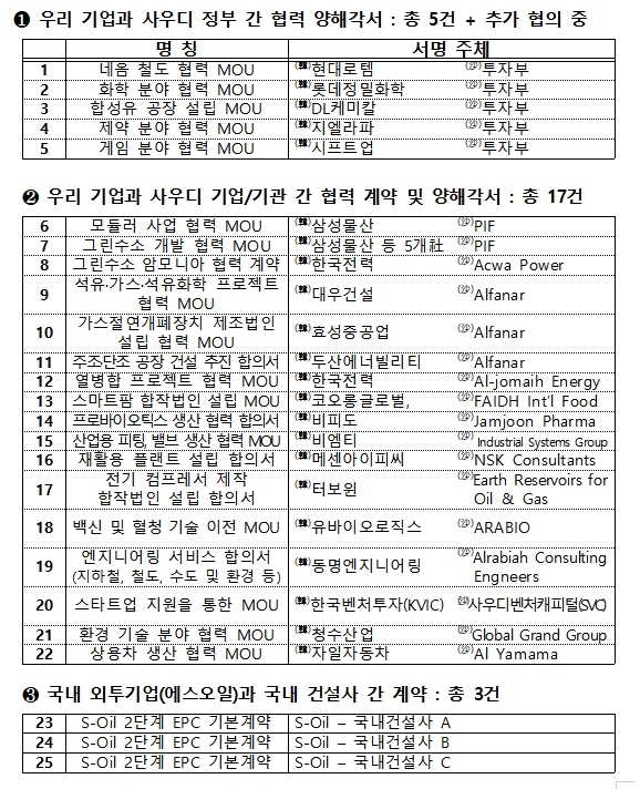 공기업이 포함된 한국 기업과 사우디 기업·기관 간 협력 계약 및 MOU는 총 17건이 체결됐다.