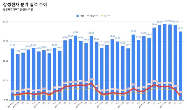 4분기 매출은 70조원으로 전년 대비 8.58% 감소했다.