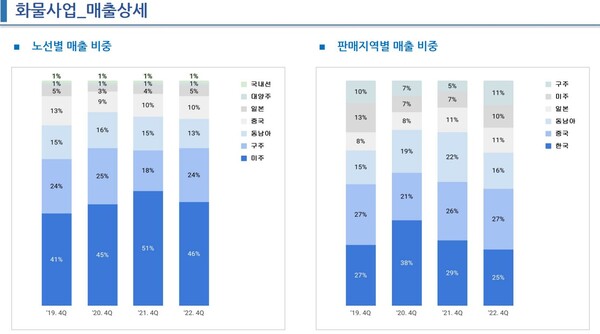 4분기 화물 매출은 1조5483억원으로 전년 동기 대비 29% 감소했다. 글로벌 경기 둔화에 따른 수요 감소, 여객기 벨리(Belly, 하부 화물칸) 공급 회복 등에 따른 시장 운임 하락 영향때문이라 대한항공 측은 설명했다.