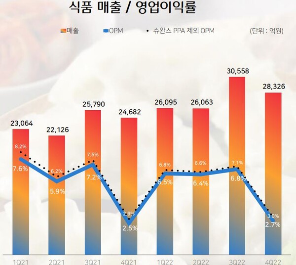 국내 식품, F&C(푸드&케어) 원가 부담 확대로 영업이익이 줄었으나 식품, 바이오, F&C 등 전 사업 부문의 매출 성장이 지속됐다,