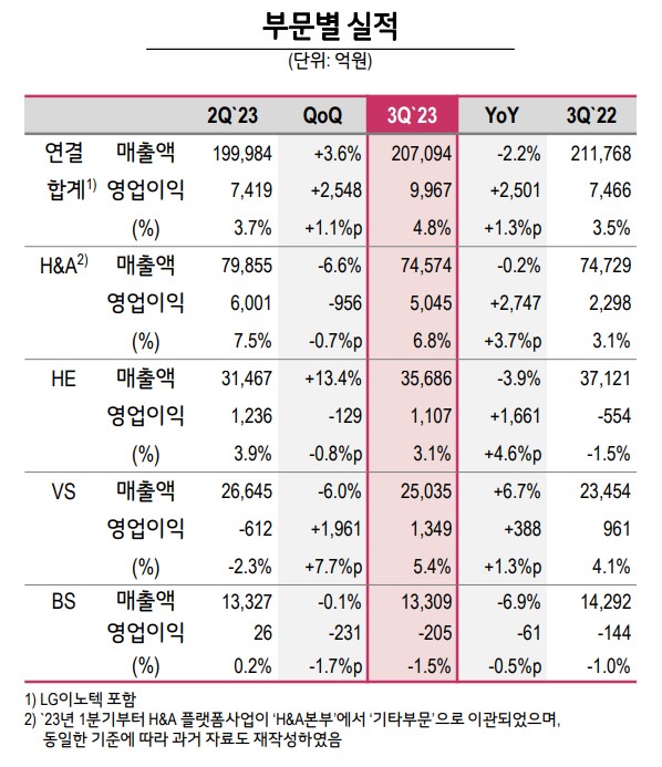 사업부문별로 보면 H&A(가전) 부문 3분기 영업이익은 5045억원으로 119.5% 성장했다. 매출은 7조4574억원으로 0.2% 감소했다.