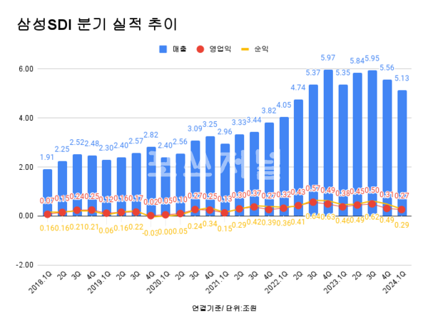 중대형 전지는 전방수요 둔화에도 불구하고 견조한 수익성을 기록했다고 삼성SDI는 설명했다.