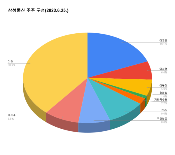 이재용 19.06%, 이서현 6.56%, 이부진 5.88%, 홍라희 1.02%, 기타특수관계인 2.21%, KCC 9.57%, 국민연금 7.98%, 자사주 8.78%, 기타 소액주주38.94%.