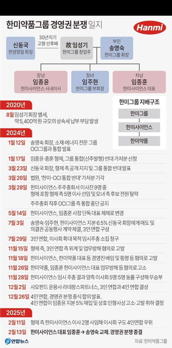 한미약품그룹 경영권 분쟁은 지난해 초 송 회장과 임주현 부회장이 OCI그룹과 통합을 추진하자 임종윤 한미사이언스 이사와 임종훈 대표가 반발하면서 촉발됐다.