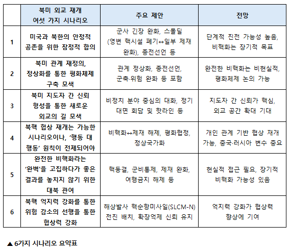 보고서에는 한미 양국의 외교·안보 전문가들이 대거 참여해 북미 간 외교 재개 가능성과 이에 따른 전략적 대응을 6가지 시나리오로 분석했다.